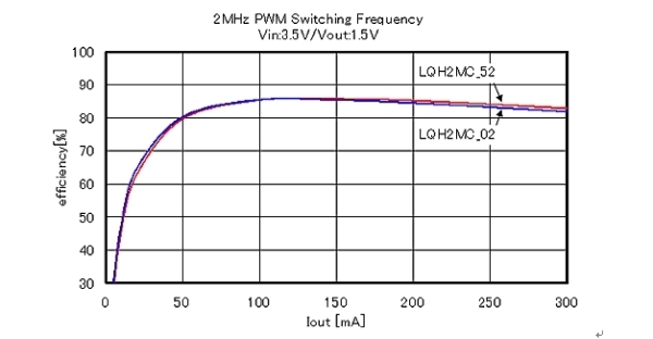 圖3展示了降壓型DC-DC轉(zhuǎn)換器使用時,使用LQH2MCN2R2M02及LQH2MCN2R2M52時的電源電壓變換效率的評價結(jié)果。LQH2MC_52系列雖最大厚度只有0.7mm的小型化產(chǎn)品,但卻和最大0.95mm厚的LQH2MC_02系列一樣,達(dá)到了很高的電源電壓變換效率。