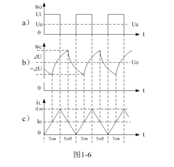 圖1-6是串聯(lián)式開關(guān)電源工作于臨界連續(xù)電流狀態(tài)時,串聯(lián)式開關(guān)電源電路中各點電壓和電流的波形。圖1-6中,Ui為電源的輸入電壓,uo為控制開關(guān)K的輸出電壓,Uo為電源濾波輸出電壓,iL為流過儲能濾波電感電流,Io為流過負載的電流。圖1-6-a)是控制開關(guān)K輸出電壓的波形;圖1-6-b)是儲能濾波電容C的充、放電曲線圖;圖1-6-c)是流過儲能濾波電感電流iL的波形。當串聯(lián)式開關(guān)電源工作于臨界連續(xù)電流狀態(tài)時,控制開關(guān)K的占空比D等于0.5,流過負載的電流Io等于流過儲能濾波電感最大電流iLm的二分之一。