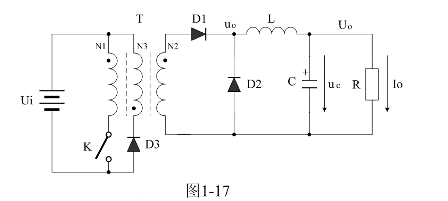 圖1-17是正激式變壓器開(kāi)關(guān)電源的簡(jiǎn)單工作原理圖,圖1-17中Ui是開(kāi)關(guān)電源的輸入電壓,T是開(kāi)關(guān)變壓器,K是控制開(kāi)關(guān),L是儲(chǔ)能濾波電感,C是儲(chǔ)能濾波電容,D2是續(xù)流二極管,D3是削反峰二極管,R是負(fù)載電阻。