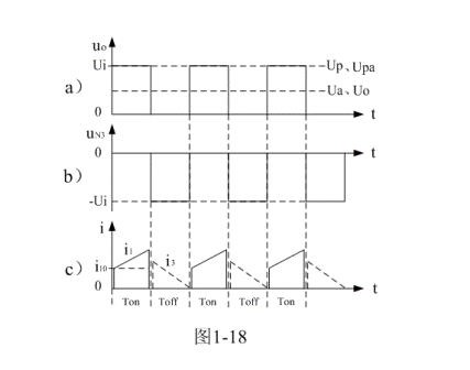 圖1-17中,在Ton期間,控制開(kāi)關(guān)K接通,輸入電源Ui對(duì)變壓器初級(jí)線圈N1繞組加電,初級(jí)線圈N1繞組有電流i1流過(guò),在N1兩端產(chǎn)生自感電動(dòng)勢(shì)的同時(shí),在變壓器次級(jí)線圈N2繞組的兩端也同時(shí)產(chǎn)生感應(yīng)電動(dòng)勢(shì),并向負(fù)載提供輸出電壓。開(kāi)關(guān)變壓器次級(jí)線圈輸出電壓大小由(1-63)、(1-69)、(1-76)、(1-77)等式給出,電壓輸出波形如圖1-18-a)。