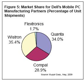 通常,Dell將個人移動PC制造交予Wistron,將企業(yè)移動PC制造交予Compal,Quanta則兩者兼有。圖中的數(shù)據(jù)顯示2008年Wistron為Dell完全制造的移動PC的份額超過了50%。