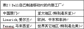 在后端,Dell采用復(fù)雜的按客戶訂單進行配置(CTO)的營運模式來支持這種產(chǎn)品定制。對移動PC,Dell有三個內(nèi)部制造工廠來支持它所服務(wù)的主要終端市場。表2所示為Dell自己制造移動PC的內(nèi)部工廠。
