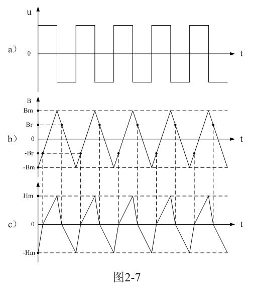 在正常情況下,當(dāng)有交流脈沖電壓輸入時(shí),磁通密度B就會(huì)沿著理想磁化曲線d-a,由負(fù)最大值-Bm至正最大值Bm,然后,又由正最大值Bm至負(fù)最大值-Bm,來回地變化;對(duì)應(yīng)磁場(chǎng)強(qiáng)度H也是沿著理想磁化曲線d-a由負(fù)最大值-Hm至正最大值Hm,然后,又由正最大值Hm至負(fù)最大值-Hm,來回變化。
