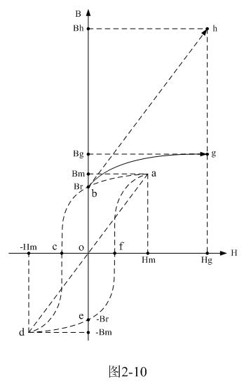 但當(dāng)變壓器鐵芯中的磁化過程是從上次剩余磁通密度Br的位置開始時(shí),上面所分析的理想磁化過程將要被破壞,磁通密度B不會(huì)再沿著理想磁化曲線d-a進(jìn)行,而是沿著另一條新的等效磁化曲線進(jìn)行;這條新的等效磁化曲線應(yīng)該與原理想磁化曲線d-a平行,并且經(jīng)過Br點(diǎn),圖2-10中虛線b-h就是這條新的等效磁化曲線的一部分。這里只畫出新等效磁化曲線的一半,另一半在圖2-10中沒有畫出。