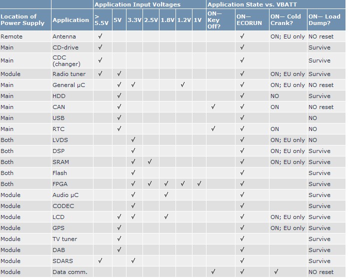 大多數(shù)系統(tǒng)電源的基本架構(gòu)選擇應(yīng)從電源要求以及汽車廠商定義的電池電壓瞬變波形入手。對(duì)于電流的要求應(yīng)該反映到電路板的散熱設(shè)計(jì)。表1歸納了大多數(shù)設(shè)計(jì)的電路及電壓要求。