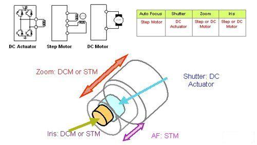 光學(xué)變焦可采用直流馬達(dá)或步進(jìn)馬達(dá)來實現(xiàn)。對于快速變焦作業(yè),特別是當(dāng)DSC電源打開時,采用直流馬達(dá)更好,因為它的轉(zhuǎn)矩大于步進(jìn)馬達(dá)的轉(zhuǎn)矩。但另一方面,為在正常作業(yè)時進(jìn)行平滑和精確的變焦,采用步進(jìn)馬達(dá)可能會更好些。對于單光圈應(yīng)用,可使用DC致動器調(diào)節(jié)光圈,而當(dāng)需要精確控制位置時則采用步進(jìn)馬達(dá)。