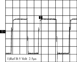 開關(guān)管S1和S的Uds波形如圖3所示,RefA為S管壓降波形,50V/div,RefB為S1管壓降波形,50V/div。電路此時(shí)工作在Vin=60V左右,S1和S的開關(guān)應(yīng)力大概為120V,D=0.5左右。圖4為變壓器輸出電壓,也就是同步整流管SR1和SR的驅(qū)動(dòng)信號(hào),正的部分為SR的驅(qū)動(dòng)信號(hào),負(fù)的部分為SR1的驅(qū)動(dòng)信號(hào)。實(shí)驗(yàn)所得波形和分析的波形基本吻合,只是在開關(guān)轉(zhuǎn)換瞬間,電壓有小尖峰,這是由電路的雜散參數(shù)引起的。該電路的工作效率經(jīng)過(guò)測(cè)量大約在90%左右,基本達(dá)到設(shè)計(jì)的要求。