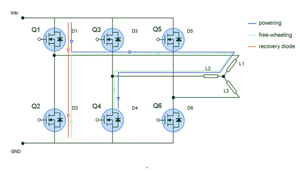 步驟1)功率級同時給兩個相位供電,而對第三個相位未供電。假設供電相位為L1、L2,L3未供電。在這種情況下,MOSFETQ1和Q2處于導通狀態(tài),電流流經(jīng)Q1、L1、L2和Q4。
