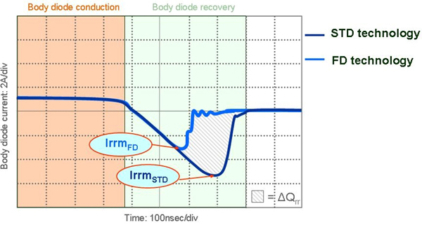 為改善在這些特殊應用中體二極管的性能,研發(fā)人員開發(fā)出具有快速體二極管恢復特性MOSFET。當二極管導通后被反向偏置,反向恢復峰值電流Irrm較小,完成恢復所需要的時間更短(見圖3)。