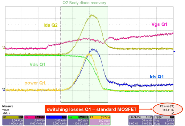 我們對比測試了標準的MOSFET和快恢復MOSFET。ST推出的STD5NK52ZD(SuperFREDmesh系列)放在Q2(LF)中,如圖4b所示。在Q1MOSFET(HF)的導通工作期間,開關損耗降低了65%。采用STD5NK52ZD時效率和熱性能獲得很大提升(在不采用散熱器的自由流動空氣環(huán)境下,殼溫從60°C降低到50°C)。在這種拓撲中,MOSFET內(nèi)部的體二極管用作續(xù)流二極管,采用具有快速體二極管恢復特性MOSFET更為合適。