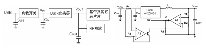 如果直接用降壓變換器全額輸出為射頻模塊供電,則要設計一個輸出電流為2A的降壓變換器(圖1a)。