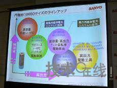 圖4:三洋電機(jī)移動(dòng)能源公司業(yè)務(wù)開發(fā)統(tǒng)括部統(tǒng)括部長雨堤徹 圖5:通用圓筒形單元(18650)的產(chǎn)品陣容。根據(jù)用途區(qū)分使用