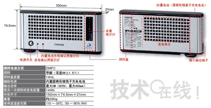東芝已上市的外置燃料電池能為可用USB充電的便攜產(chǎn)品充電。1mL燃料能發(fā)電1Wh,充一次燃料能發(fā)電約14Wh。