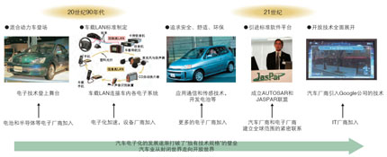 近10年來,從引進CAN車載LAN接口規(guī)格到標準化團體的建立,汽車電子化不斷前進,這表明汽車工業(yè)正從垂直整合的封閉世界走向水平分工的開放世界。2008年在紐約召開的全球第15屆ITS(智能交通系統(tǒng))大會上,通用汽車的展臺上出現(xiàn)了Google公司的產(chǎn)品,不少歐洲公司也開始提供Google的地圖服務,日產(chǎn)公司也與Google Maps牽手,提供目的地導航服務。汽車業(yè)界的封閉堅冰已經(jīng)打破,開放匯為潮流。