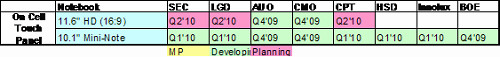 隨著Windows 7推出與對未來市場影響力,2010年多數(shù)面板廠商針對Notebook PC市場積極開發(fā)具觸控功能11.6寸寬螢?zāi)幻姘?,同時每一家生產(chǎn)迷你筆電面板廠商也都開發(fā)具有觸控功能面板。從下表一可以清楚了解每一廠商開發(fā)具觸控功能Notebook PC或迷你筆電面板時間表。