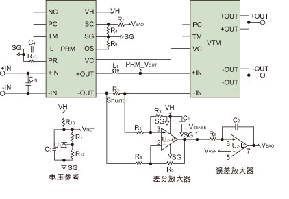 上述電路由電壓參考、分流電阻、差分放大器和誤差放大器組成。低端檢測電路是在PRM輸出端用配置為差分放大器的一個(gè)運(yùn)放實(shí)現(xiàn)的。分流電阻(R1)上的電壓經(jīng)檢測并被放大電阻R2到R5確定的增益倍數(shù)。參考電壓使用精確可調(diào)的分流參考產(chǎn)生,并連接到誤差放大器的同相端子。這是誤差放大器用以與差分放大器輸出(VSENSE)比較的電壓。誤差放大器的輸出(VEAO)經(jīng)過電阻R7和R8連接到SC,從而實(shí)現(xiàn)PRM輸出設(shè)置點(diǎn)的調(diào)整。誤差放大器將調(diào)整PRM輸出電壓,直到VSENSE等于參考電壓VREF。這將迫使VTM輸入電流以及VTM輸出電流成為由VREF確定的常數(shù)。