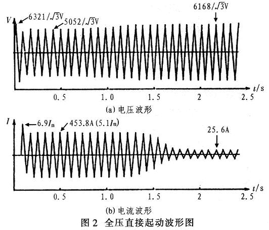 圖2為全壓直接起動的電壓、電流波形。由圖2(a)電壓波形可見,電動機(jī)起動前系統(tǒng)電壓為