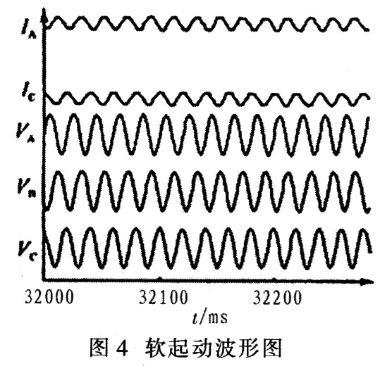 通過對比驗(yàn)證看出,用軟起動效果遠(yuǎn)好于常規(guī)起動,雖然在起動過程中,起動電流中含有一定的高次諧波,而電壓中卻只有很小的高次諧波,電壓的總諧波畸變率為2.72%,如見圖4所示,所以并不會對系統(tǒng)造成影響。