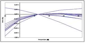 為了在各種溫度變化下獲得更好的性能,愛(ài)特梅爾增加了一個(gè)額外的基準(zhǔn)電壓校準(zhǔn)機(jī)制,用以調(diào)節(jié)帶隙基準(zhǔn)源的溫度系數(shù)。這個(gè)校準(zhǔn)步驟將調(diào)節(jié)曲率的形狀和位置,并顯著改善隨溫度變化的穩(wěn)定性,如圖4所示,在-20~+85℃溫度范圍內(nèi)的最大變化是0.5%。注意第二個(gè)校準(zhǔn)步驟可以檢測(cè)和顯示出具有截然不同的曲線(xiàn)形狀的離群點(diǎn)。