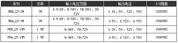 WRB_LT-3W、WRA_LT-3W系列專為采用低輸入電壓電源的情況而設(shè)計(jì),可接受低至4.5V-9V的輸入電壓;PWB_LT-1W5、PWA_LT-1W5可滿足超寬4:1輸入范圍的要求; -40℃~+85℃的寬溫度工作范圍保證產(chǎn)品能夠適應(yīng)多種環(huán)境條件的使用;產(chǎn)品具體電氣特性如下表: