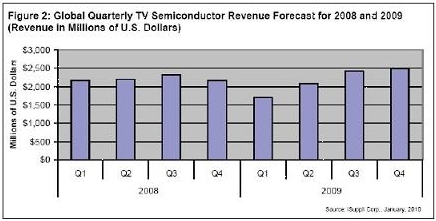 2010年市場(chǎng)更加接受互聯(lián)網(wǎng)驅(qū)動(dòng)、支持LED背光和100/120Hz幀速率轉(zhuǎn)換技術(shù)等功能的先進(jìn)電視,將有利于推動(dòng)電視半導(dǎo)體市場(chǎng)達(dá)到新的高度。iSuppli公司目前預(yù)測(cè),2010年電視半導(dǎo)體營(yíng)業(yè)收入將比2009年增長(zhǎng)19%。