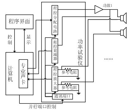 常見的專業(yè)聲卡一般只具備兩個(gè)輸入通道,兩個(gè)輸出通道,而功率試驗(yàn)要求能夠同時(shí)對(duì)多個(gè)通道進(jìn)行測試,故需要分配電路實(shí)現(xiàn)信號(hào)選擇;此外,專業(yè)聲卡的電壓工作范圍在1至2伏之間,揚(yáng)聲器的實(shí)際工作電壓和工作電流有較大的變化范圍,因此需要進(jìn)行電平變換才能和聲卡連接。綜合這些因素,需要一套獨(dú)立的功率試驗(yàn)儀和聲卡相配合,才能完成測試功能。功率試驗(yàn)儀內(nèi)部由程控分配電路、程控衰減器、程控放大器、通訊端口、電源電路和接線端子等部分組成。整個(gè)硬件平臺(tái)結(jié)構(gòu)如圖1所示。