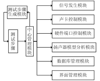 系統(tǒng)軟件采用模塊化設(shè)計(jì)方法,整個(gè)系統(tǒng)包含中心管理模塊、測試步驟生成模塊、聲卡控制模塊、信號(hào)發(fā)生模塊、揚(yáng)聲器模型分析模塊、硬件端口控制模塊、數(shù)據(jù)庫管理模塊和界面管理模塊等等。其中中心管理模塊為核心部分,軟件運(yùn)行時(shí)從該模塊進(jìn)入,其它功能模塊均在該模塊的管理下,協(xié)調(diào)一致的工作。各功能模塊均有標(biāo)準(zhǔn)的數(shù)據(jù)接口,統(tǒng)一經(jīng)過中心控制模塊完成數(shù)據(jù)交換,彼此之間不獨(dú)自發(fā)生聯(lián)系,因此可以保證模塊的獨(dú)立性,為程序的維護(hù)和升級(jí)建立了良好基礎(chǔ)。各個(gè)模塊完成的功能如下所述: