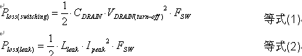 要滿(mǎn)足上述規(guī)范對(duì)外部電源工作能效及待機(jī)能耗的要求,我們首先需要分析清楚損耗的來(lái)源。事實(shí)上,就工作時(shí)的損耗來(lái)說(shuō),主要包括兩個(gè)方面,分別是開(kāi)關(guān)損耗和由泄漏電感導(dǎo)致的損耗,這兩類(lèi)損耗分別可以用等式(1)和等式(2)來(lái)量化: