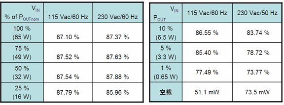 典型65 W筆記本適配器演示板能效測(cè)試結(jié)果