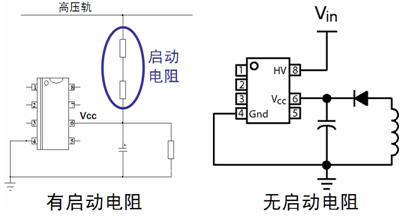 而就待機(jī)模式而言,一個(gè)重要的損耗來(lái)源于啟動(dòng)電路的靜態(tài)損耗,即啟動(dòng)電阻持續(xù)地從大電容消耗電流,造成功率損耗。而降低啟動(dòng)電路損耗的途徑有多種,如采用具有極低啟動(dòng)電流的控制器、采用關(guān)斷時(shí)泄漏電流極低的集成啟動(dòng)電流源,以及連接啟動(dòng)電路至半波整流交流輸入等。