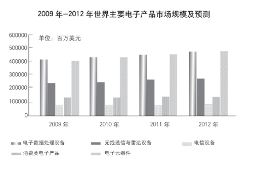 未來3年內,電子數據處理設備、電子元器件、無線通信產品和消費類電子產品份額仍將占據世界電子產品份額的前4位。2009年上述4種電子產品所占比例分別是28.18%、27.99%、16.37%、9.20%。其中電子數據處理設備和消費類電子產品所占份額分別比2008年提高了0.77%和0.33%。未來3年內,世界主要電子產品所占份額的比重基本保持穩(wěn)定,電子元器件所占比重略有增加,預計將由2009年的27.99%增加到2012年的28.89%,電子數據處理設備將由28.18%增加到28.43%。