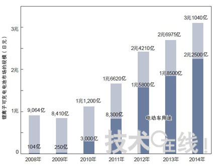5年內(nèi)成長90倍——鋰離子充電電池市場正處于大轉(zhuǎn)型期。在被電動車(EV)采用后,預(yù)期鋰離子充電電池市場在未來5年內(nèi)將超越3萬億日元。技術(shù)發(fā)展的激烈競爭已展開,一系列新加入公司使得情況更為熱鬧。