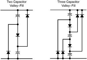 業(yè)界有關無源(Passive)功率因數校正(PFC)的方案眾多,這些方案通常都使用較多的額外元器件,其中的一種方案就是谷底填谷(valley-fill)整流器,其中采用的電解電容和二極管組合增大了線路頻率導通角,從而改善功率因數。實際上,這個過程利用高線路電壓以低電流給串聯電容充電,然后在較低電壓時以較大電流讓電容放電給開關穩(wěn)壓器。典型應用使用2個電容和3個二極管,而要進一步增強功率因數性能,則使用3顆電容和6個二極管。