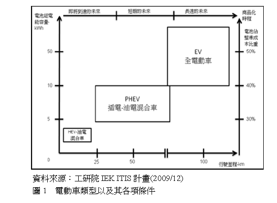 2009年車用鋰電池目前佔整體鋰電池應用約1%市場比重很小,使用到電池做為電力系統(tǒng)的電動車型態(tài)包括HEV、PHEV、EV,這三種車輛可行駛的里程以及對於電池容量的要求如圖1。對於電池能量的需求、一次充電後可行駛的里程以及電池組佔整車成本的比重都是EV>PHEV>HEV,當然EV是最理想的電動車型態(tài),但是以目前的電池材料技術尚難以達到,所以電動車的發(fā)展也仍然必需循序漸進的進行。由使用電池數(shù)量較少的HEV先用,再逐步擴展到EV市場。