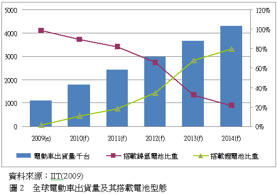 - 到2012年鎳氫電池約佔全球電動車比重的六成五、鋰電池佔三成五