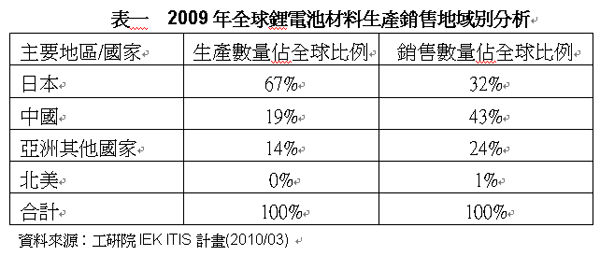 在生產(chǎn)與銷售地區(qū)上,在2009年仍然呈現(xiàn)集中于亞洲的態(tài)勢,其中日本仍為最主要的正極材料生產(chǎn)與銷售大國,雖然在日本國內(nèi)因生產(chǎn)成本高漲之故,鋰電池的制造出口逐年下降中,但至今全球仍有近67%的鋰電池正極材料在日本生產(chǎn),中國與其他亞洲地區(qū)僅占19%與14%。至于在銷售地區(qū)分布上,由于下游的電池大廠仍以日商為多,因此日本仍為銷售地區(qū)比例最高的國家,其他依序為中國、其他亞洲地區(qū)、北美等地。