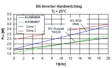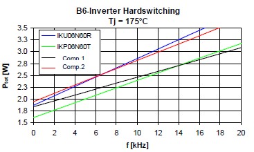 衡量一個(gè)IGBT的好壞有兩個(gè)非常重要的指標(biāo),一個(gè)就是它的飽和導(dǎo)通壓降,就是Vce(sat),另外一個(gè)就是開關(guān)損耗,也就是Eoff。對(duì)于低頻的應(yīng)用來(lái)說,飽和導(dǎo)通壓降是占有絕對(duì)支配地位的,所以選擇這種RC-Drives的IGBT會(huì)是一個(gè)非常好的選擇,因?yàn)榭梢钥吹竭@種RC-Drives IGBT的飽和導(dǎo)通壓降是遠(yuǎn)遠(yuǎn)低于市面上的一些產(chǎn)品。這個(gè)是在一個(gè)無(wú)刷電機(jī)上面的損耗的分析。
