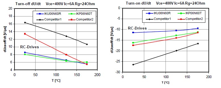 EMI也是大家非常頭痛的一個(gè)問題,也是非常關(guān)心的一個(gè)問題。逆向?qū)ㄐ虸GBT同時(shí)優(yōu)化了它的EMI的性能,它有一個(gè)非常好的開關(guān),非常平滑的一個(gè)開關(guān)特性,不會(huì)有一個(gè)很大的振動(dòng),干擾。所以我們可以看到它的關(guān)斷和開通的時(shí)候dV/dt的現(xiàn)象,基本上在關(guān)斷的時(shí)候dV/dt基本上控制在一個(gè)10V/us的情況,而在開通的時(shí)候基本上也可以控制在—10V/us。