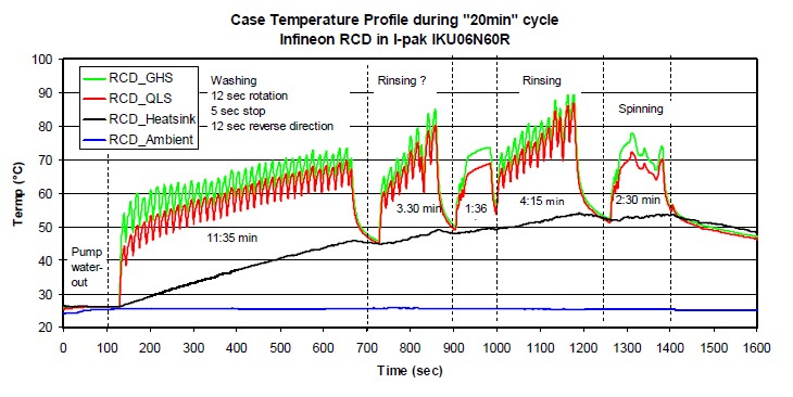 下面就是為了驗(yàn)證這種逆向?qū)ㄐ虸GBT在實(shí)際應(yīng)用當(dāng)中的一個(gè)表現(xiàn),我們?cè)谝粋€(gè)洗衣機(jī)上面驗(yàn)證了6安的IPARK的產(chǎn)品,在一個(gè)風(fēng)機(jī)上面我們驗(yàn)證了6安的DPARK的產(chǎn)品。這是一個(gè)實(shí)際的洗衣機(jī)的控制板,這種方式就是采用了夾子,然后把這個(gè)IGBT夾在散熱器上面。稍候我們會(huì)用這種IPARK的封裝對(duì)這種TO220的封裝做一些替代,然后比較一下他們的不同。就是說我們把其中的一路替代成IPARK產(chǎn)品,然后做一個(gè)效率還有溫度的檢測(cè),通過這種熱電偶的方式來(lái)檢測(cè)它的表面溫度,來(lái)檢測(cè)它的結(jié)溫。因?yàn)樗饷嬗幸粋€(gè)夾子,我們沒有辦法用紅外相機(jī)來(lái)檢測(cè)它的溫度,所以我們采用了這種熱電偶的方式。這個(gè)是洗衣機(jī)的工作流程,首先的話是抽水,這個(gè)是洗滌,這個(gè)是漂洗,這個(gè)是甩干,整個(gè)20分鐘的流程當(dāng)中它的溫度的表現(xiàn),基本上它的最高溫度沒有超過90度,我們可以看到這個(gè)綠色和紅色有一點(diǎn)稍微小小的區(qū)別,這是因?yàn)樗纳岵灰粯?,IGBT的位置放在不一樣,所以會(huì)有一點(diǎn)不一樣,這個(gè)不用太過擔(dān)心。