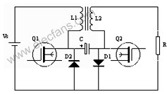 功率雙向流動CUK變換器(圖2)與傳統(tǒng)的單向功率流動CUK變換器不同的是:在原來開關(guān)管Q1和二極管D1兩端分別反向并聯(lián)二極管D2和開關(guān)管Q2如圖3所示。這個電路具有對稱性,輸入輸出電流方向可正可負。右邊負載R換為下正上負電壓源Vs,左邊電壓源Vs換為負載R,則功率從右向左倒流[2]。