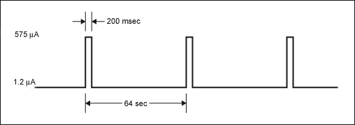 周期性地測(cè)量溫度使得器件在短時(shí)間內(nèi)(最差情況下為200ms)的電流損耗增大。圖1給出了DS3231在最差情況下的電流損耗,計(jì)算中假設(shè)電池電壓為3.63V,I²C兼容接口不工作。