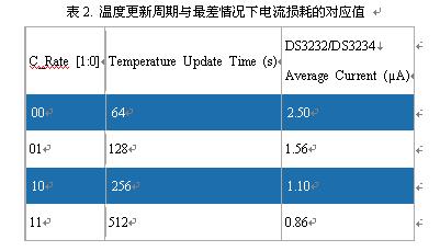 表2列出了DS3232/DS3234溫度更新周期與最差情況下電流損耗的對(duì)應(yīng)值。計(jì)算中假設(shè)電池電壓為3.63V,I²C兼容接口不工作。C_Rate位上電時(shí)默認(rèn)為0,對(duì)應(yīng)于64s的溫度更新周期。