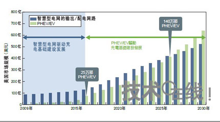 美國的充電基礎設施一開始將慢慢地隨著智能電網(wǎng)市場成長,而非PHEV/EV市場。智能電網(wǎng)的傳輸和分配網(wǎng)路升級的市場規(guī)模預估是依Morgan Stanley的資料製成。PHEV//EV市場規(guī)模是依據(jù)EPRI市場滲透率來預估,以每臺30000美元換算。
