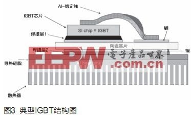 圖3顯示了帶基板的功率模塊的結(jié)構(gòu)。兩側(cè)都帶薄銅層的陶瓷襯底被焊接在基板上。IGBT芯片被焊在設(shè)計(jì)好的銅層上。芯片的表面通過(guò)綁定線(bondingwire)壓焊到銅層上。大多數(shù)標(biāo)準(zhǔn)模塊采用這種制作方法。目前70%到80%的功率模塊都按照標(biāo)準(zhǔn)模塊結(jié)構(gòu)來(lái)制造。陶瓷一般采用Al2O3,基板采用銅為材料。IGBT底板通過(guò)導(dǎo)熱硅脂安裝散熱器。