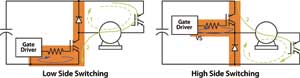 目前,大功率半導(dǎo)體器件(如IGBT和MOSFET)的發(fā)展趨勢是在提升性能的前提下不斷縮小芯片尺寸。減小芯片尺寸能減少器件的寄生電容,從而提高開關(guān)速率。因此,深入研究電路板上的關(guān)鍵回路越來越重要。圖1為電壓源變頻器(voltagesourceinverter,VSI)的兩種典型開關(guān)工作方式的簡化示意電路。在開關(guān)頻率受限的大電流應(yīng)用中,IGBT是最受歡迎的器件。上圖所示為從高壓側(cè)(HS)續(xù)流二極管到低壓側(cè)IGBT的換流。電流最初是在高壓側(cè)二極管和相應(yīng)反相半橋的IGBT形成的續(xù)流通道中。