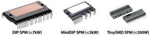 為了克服以上約束,最好采用智能功率模塊(intelligentpowermodule(IPM),也稱為SmartPowerModule(SPM®))。圖2所示為一個典型的全封閉模塊,它包含一個完整的三相電壓源變頻器,以及相應(yīng)的柵極驅(qū)動器和保護(hù)電路。采用這種模塊比分立元件方案節(jié)省電路板空間多達(dá)50%。尤其是這種模塊需要的外接部件極少,在設(shè)計上就考慮了EMC的要求。其峰值和平均EMC干擾強(qiáng)度比傳統(tǒng)設(shè)計低很多。