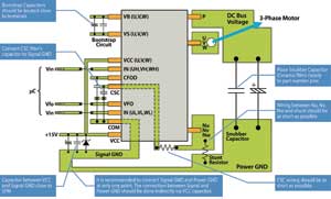 與電壓源變頻器的分立元件方案類似,采用智能功率模塊時也要注意外部元件的布局安排。圖3所示為針對Motion-SPMTM應(yīng)用的一些建議。由于電壓源變頻器的開關(guān)速率很快,信號接地和功率接地必須分開。兩種接地在15VVcc電容處互接。Vcc電容和功率接地之間的通道要狹窄,以去除耦合。為防止電涌造成破壞,引腳P與功率接地之間應(yīng)當(dāng)有一個低電感電容。另外,由于電壓源變頻器和馬達(dá)之間的長引線會造成高壓反射,因此一些SPM產(chǎn)品配備了外接?xùn)艠O電阻來調(diào)節(jié)開關(guān)速率和最大限度地減少反射。