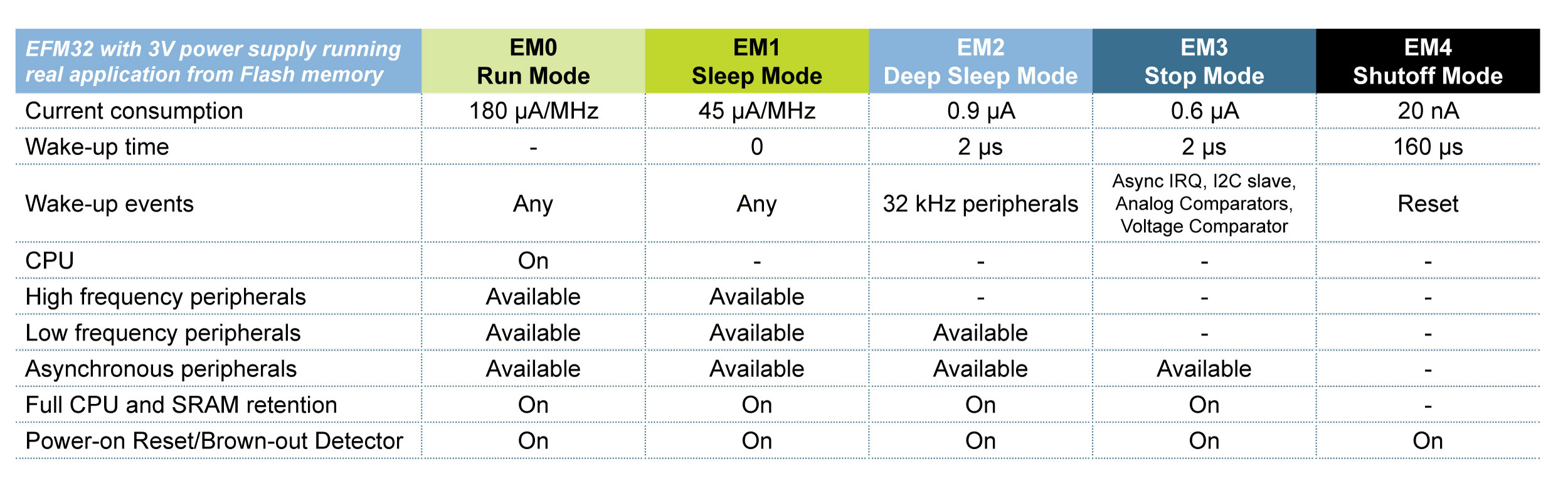 圖3. EFM32 Gecko微控制器的關(guān)鍵屬性是它提供給用戶的能源模式選擇