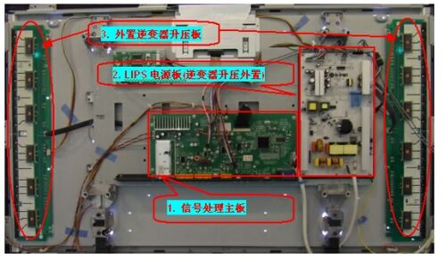 圖2:傳統(tǒng)式LCDTV內(nèi)置信號(hào)處理、AC/DC電源、DC/AC電源三塊PCB板。
