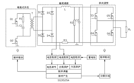 隨著經(jīng)濟水平的提高,汽車正逐漸成為人們的日常交通工具。然而,人們隨身攜帶的電子產(chǎn)品,比如手機,卻不能使用汽車上的電源。因此,開發(fā)一款經(jīng)濟實用的車載逆變器就成為一種需求。我們采用集成脈寬調制芯片SG3525A為主控芯片,以CD4020B計數(shù)器及與非門電路構成分頻分相電路并配以保護電路,實現(xiàn)了逆變器的脈寬調制。其在逆變電源工作時的持續(xù)輸出功率為100W,并具有輸出過流保護及輸入欠壓保護等功能,可實現(xiàn)電源逆變、電壓穩(wěn)定、欠壓保護及過流保護等功能。
